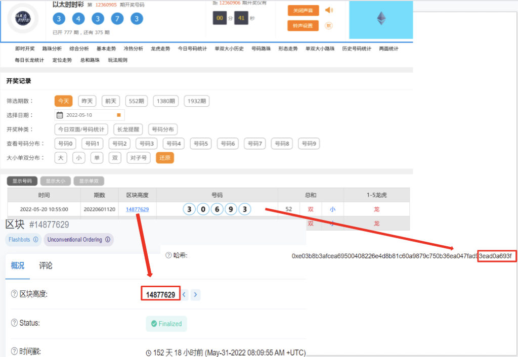 开奖号码依据https://etherscan.io/ 里的区块高度>哈希值而计算出来。